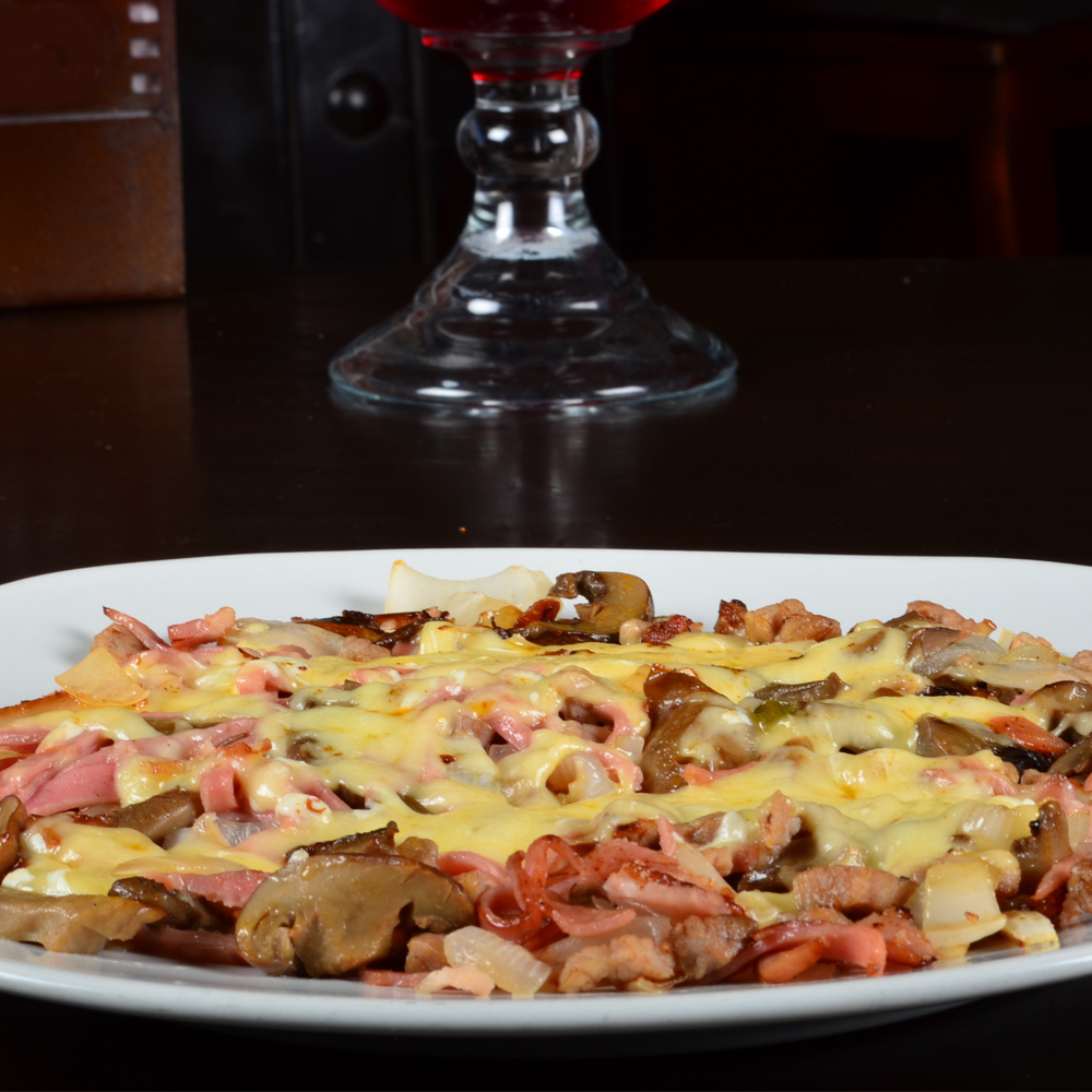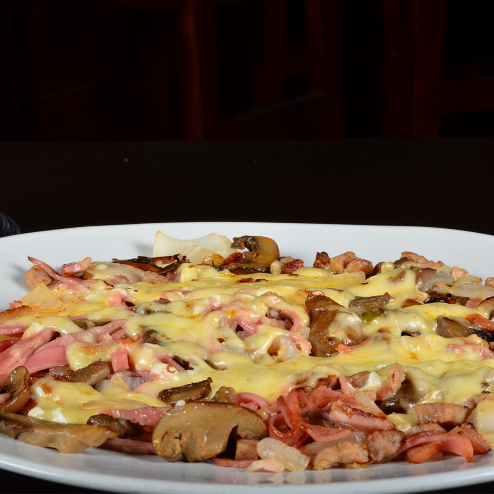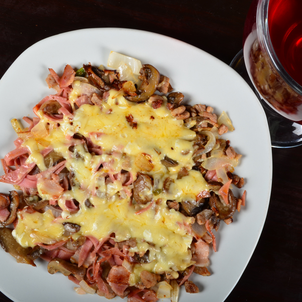Ingredientes: Bistec ó chuleta con cebolla, champiñones, tocino y queso