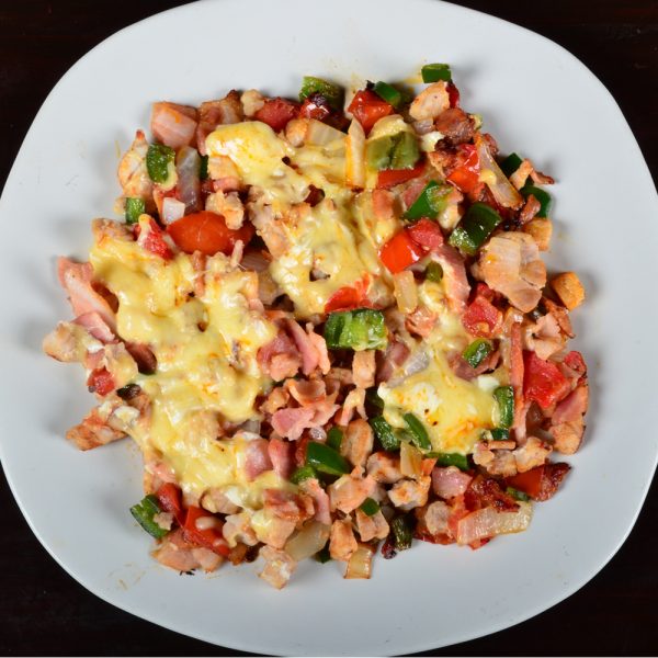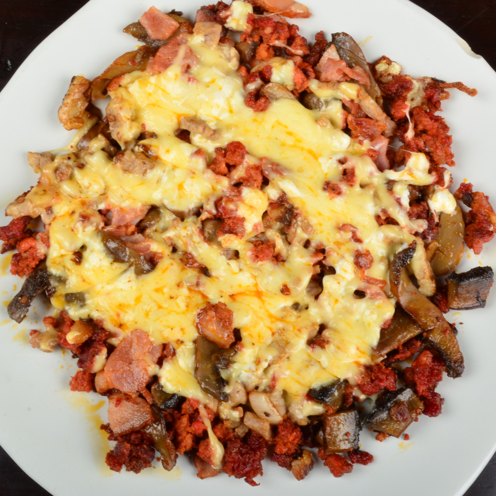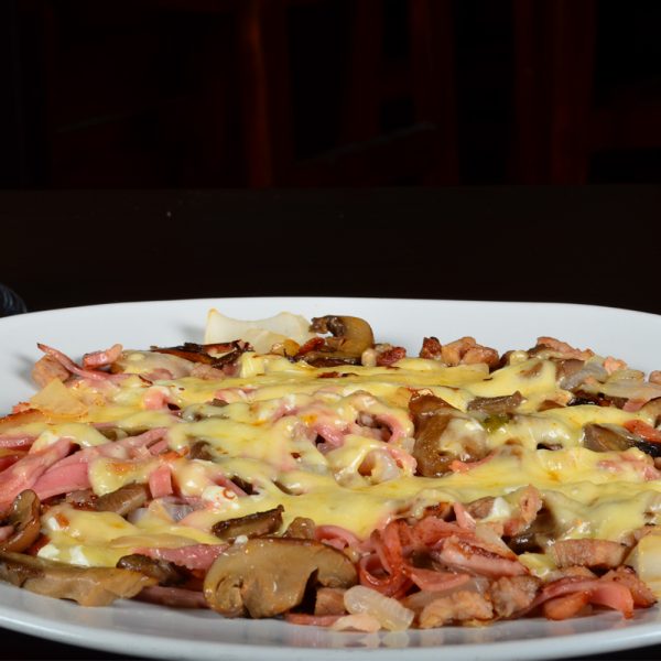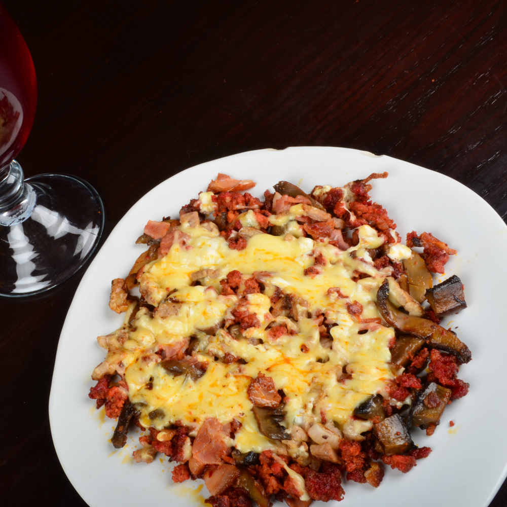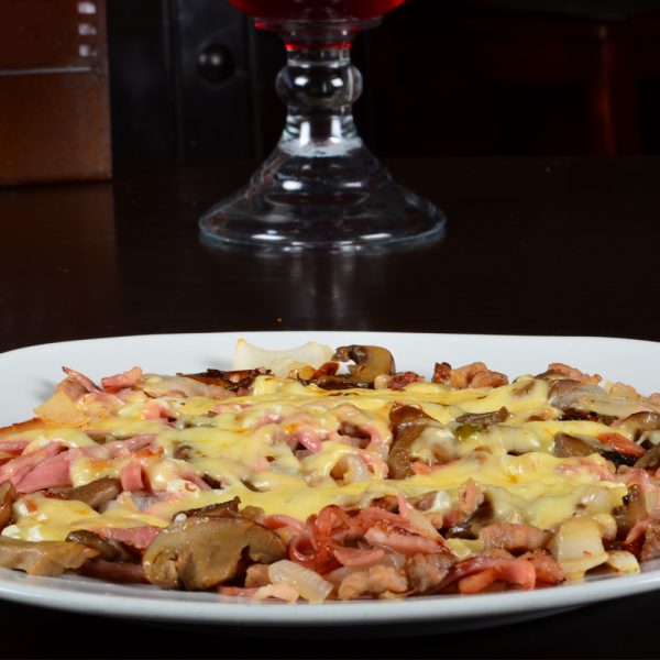 Ingredientes: Bistec ó chuleta con chorizo, champiñones, tocino y queso
